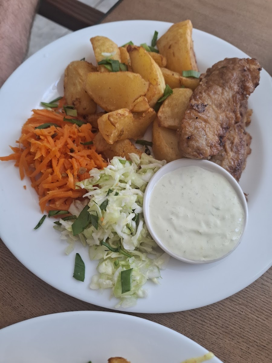 If you're in the mood for something hearty, the pork chop ("karbonāde") with sides at €5.60 and the beef steak ("C/G steiks") for €6.70 will surely satisfy your cravings. Alternatively, indulge in the duck confetti with orange risotto for a delightful fusion of flavors at €9.50, or enjoy the fresh and vibrant cod fillet with spinach and cheese for €7.50. And don’t forget to treat yourself to a slice of their scrumptious chocolate/banana cake for only €3.50!